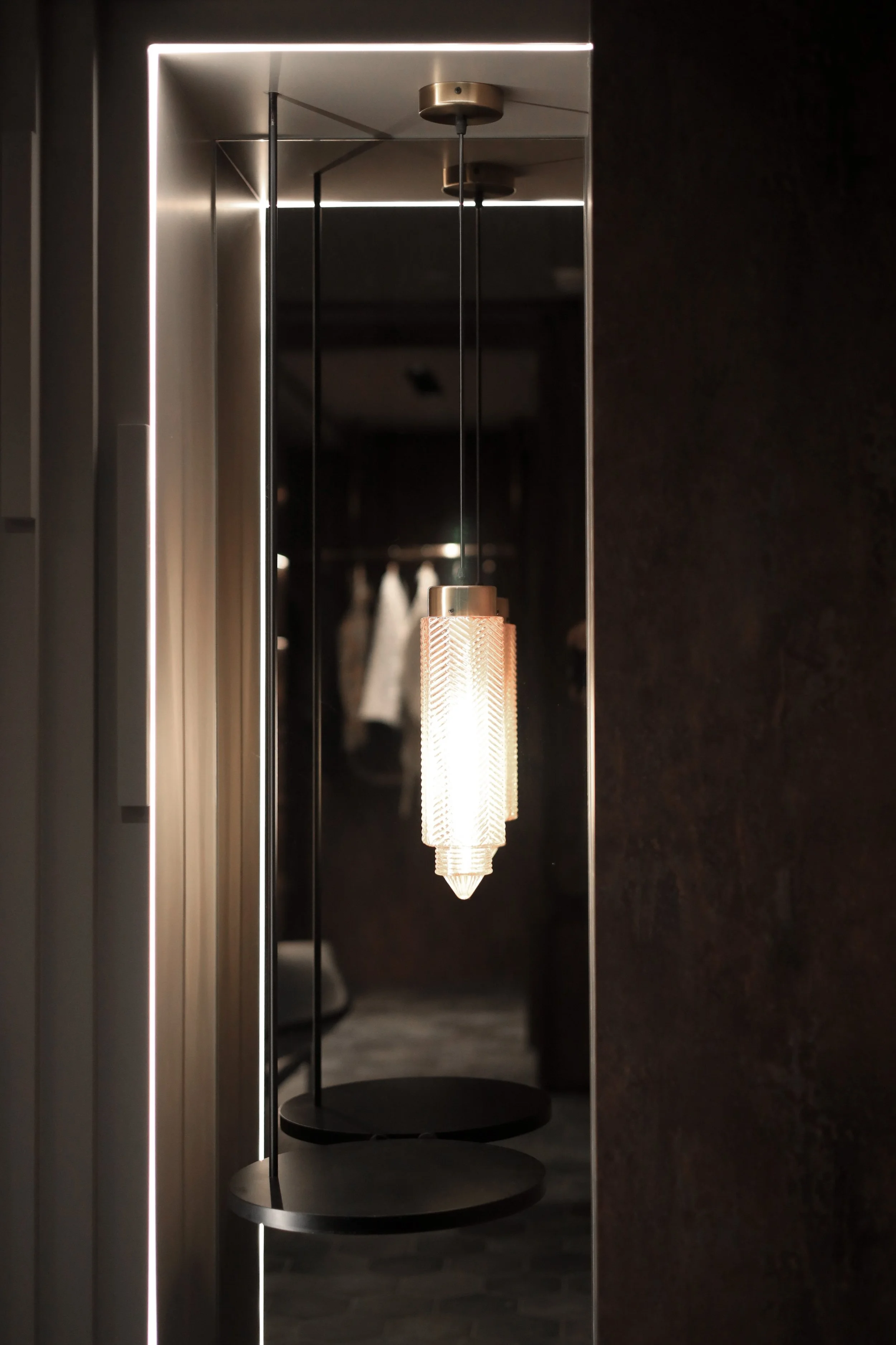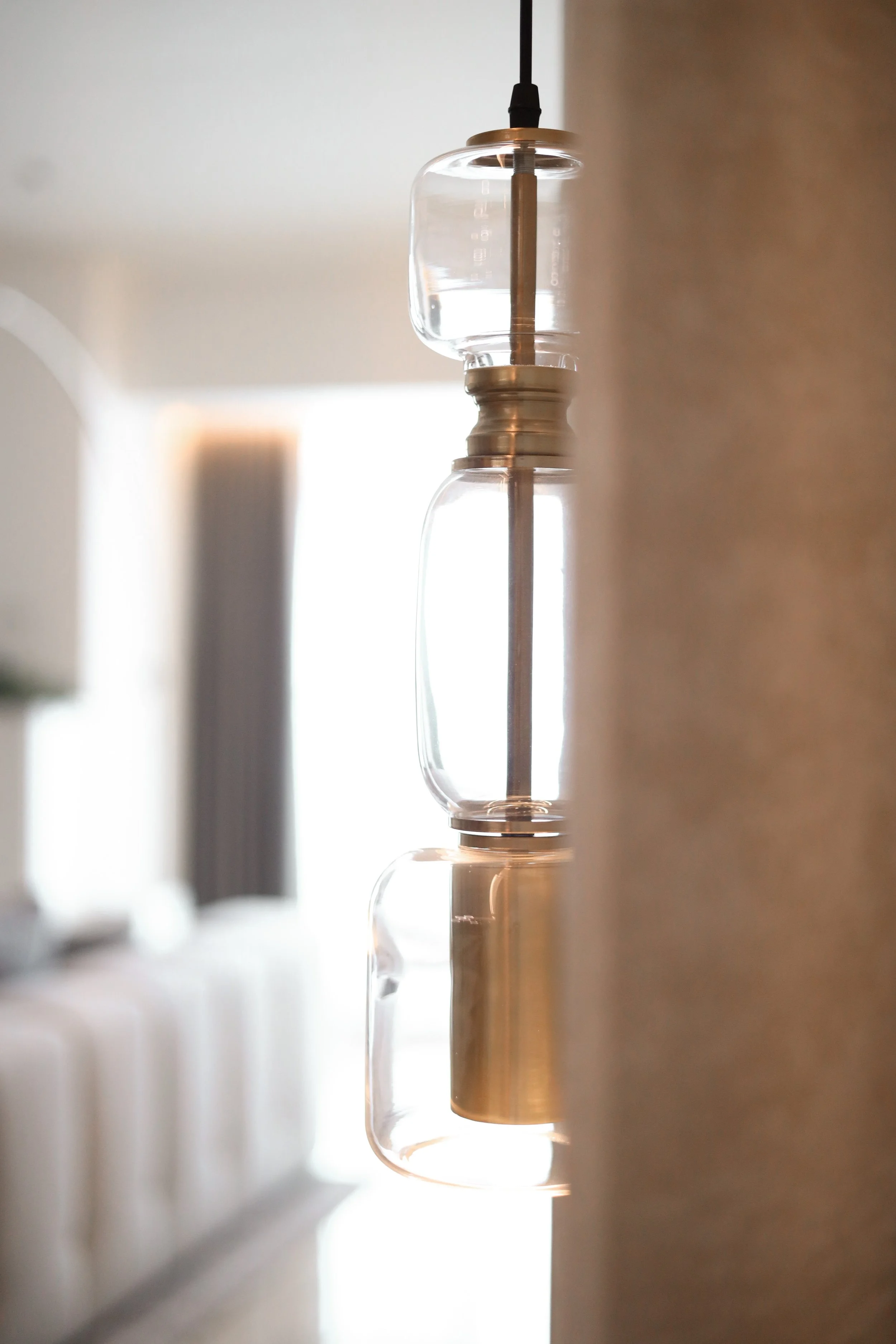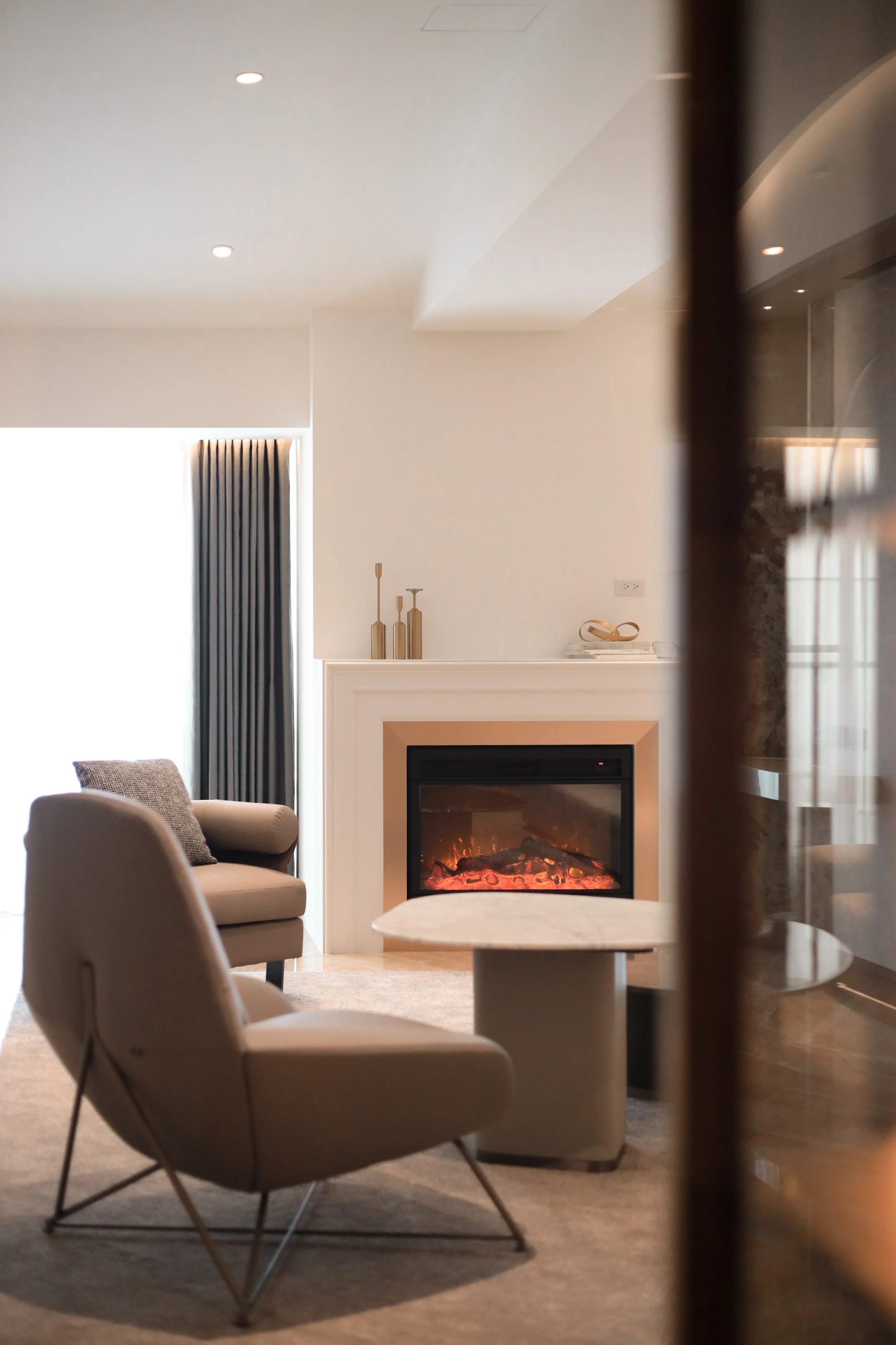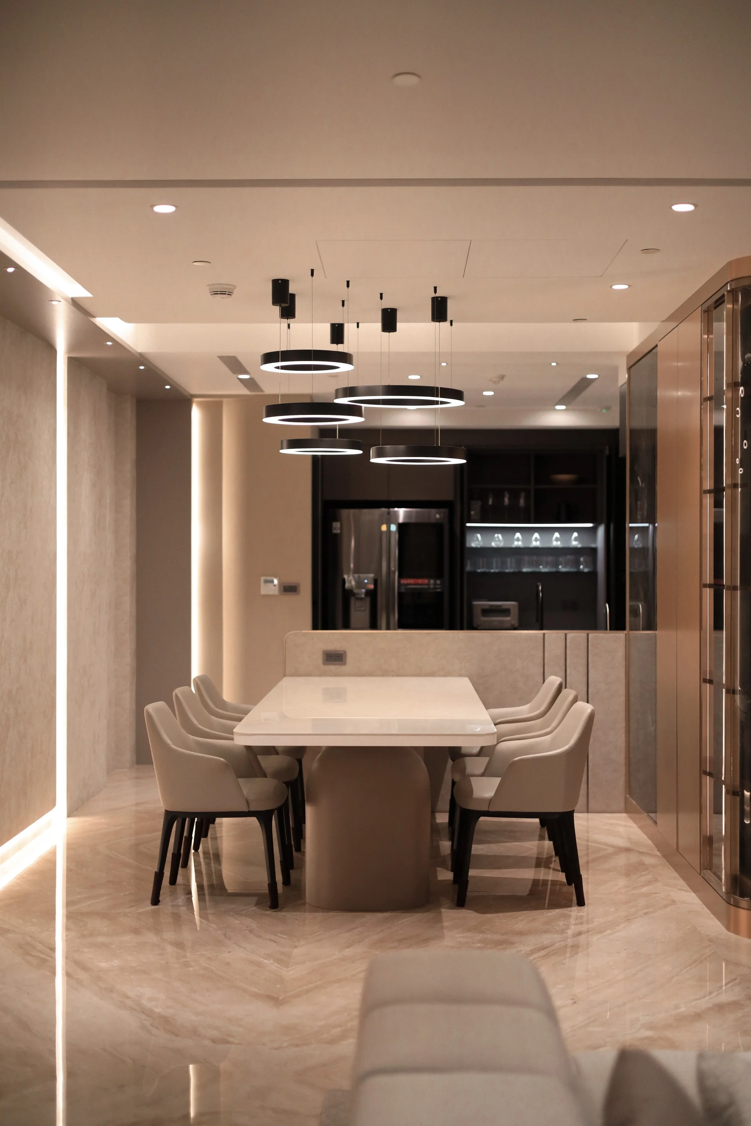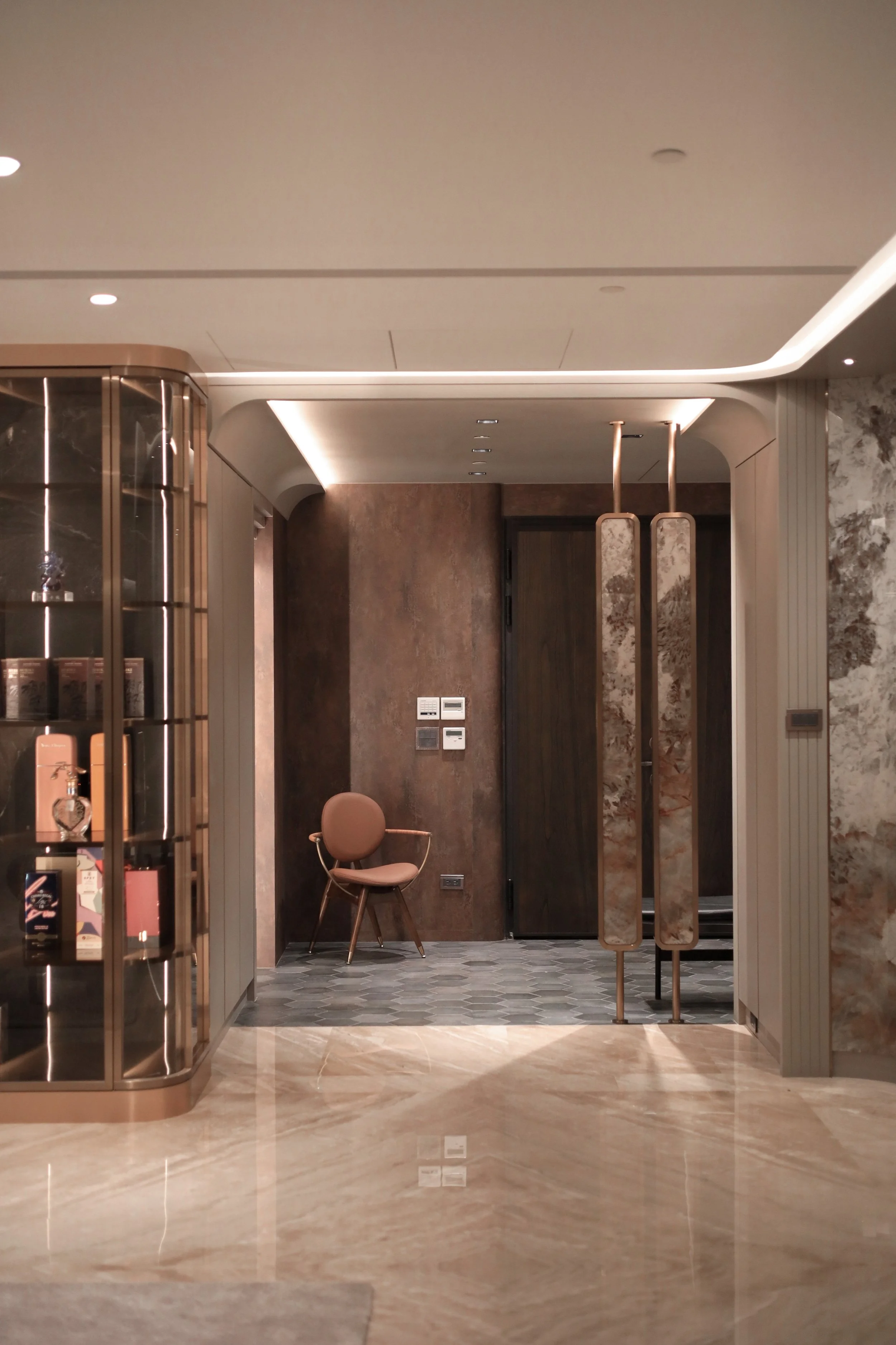 男主喜歡Art Deco,女主喜歡侘寂風格。設計汲取了裝飾藝術風格,不斷重複堆疊的元素,以及侘寂感的手感紋理和曲線,加入高雄港邊的波光粼紋,以色彩由深入淺,創造空間漸變與遞序,交織南國退休宅。