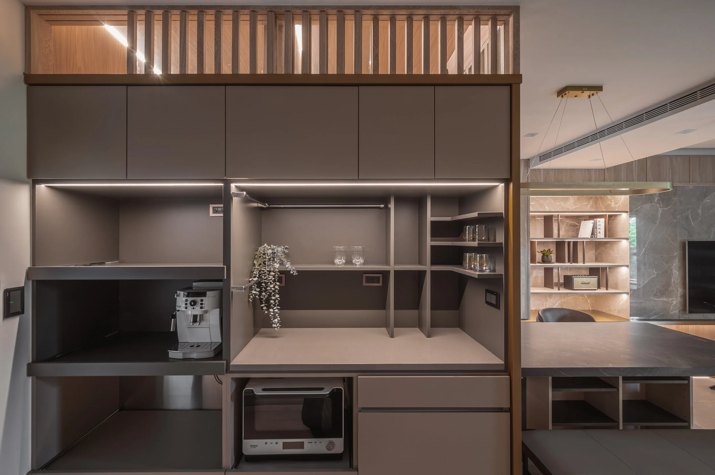 女主喜愛窗外有如被森林圍繞的綠景,因此空間配置以不擋到窗戶、讓室內能夠納入最大自然光線為原則。風格以自然的木質調加入主人喜好的輕奢質感作混搭。打通客廳後方與書房的隔間,引窗外綠意入室,擁和煦陽光舒心,技巧堆疊出居家生活儀式感,打造一家人隱於城市中的靜謐角落。